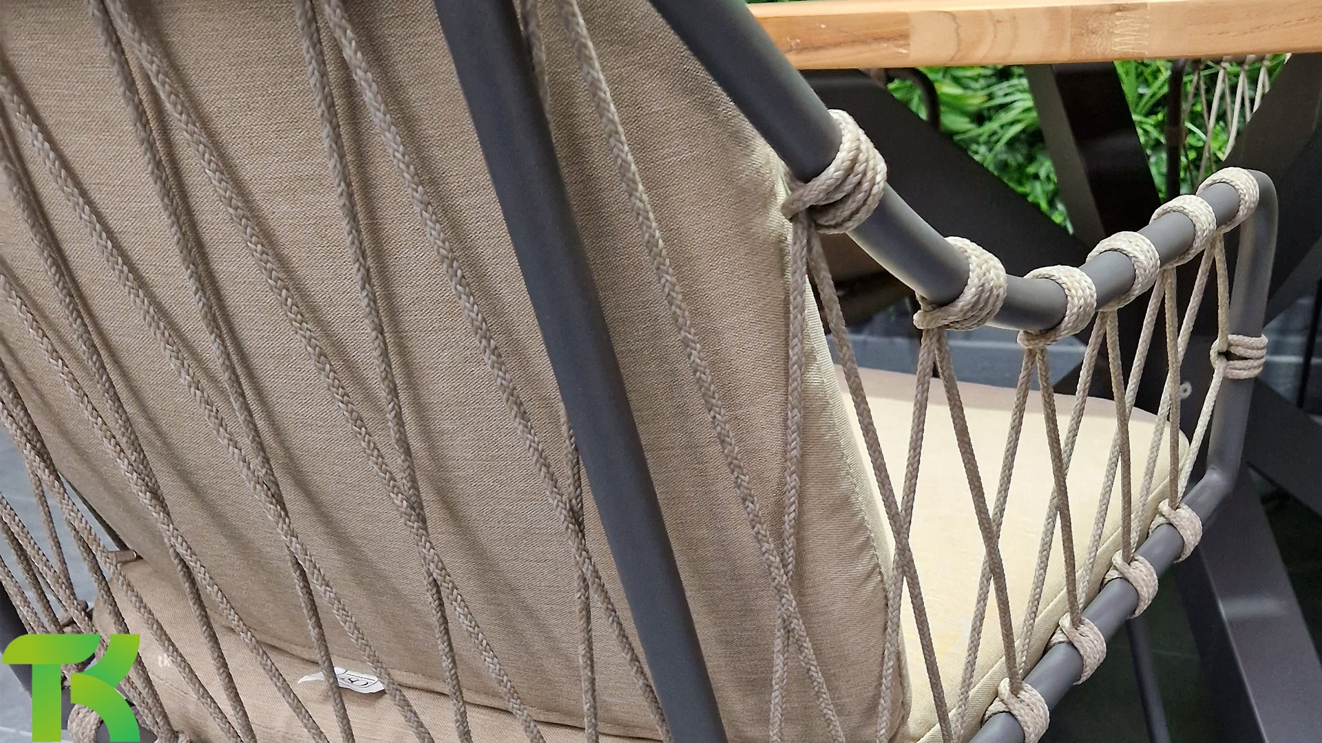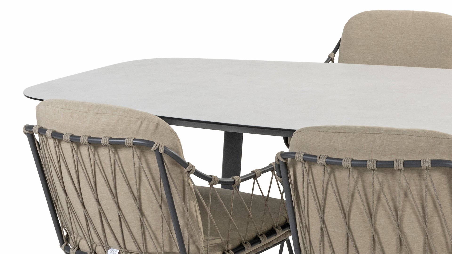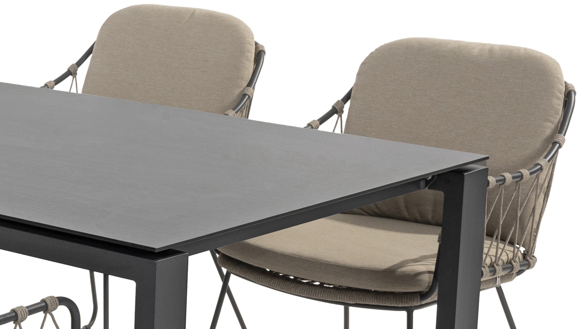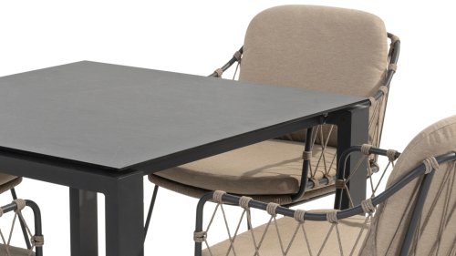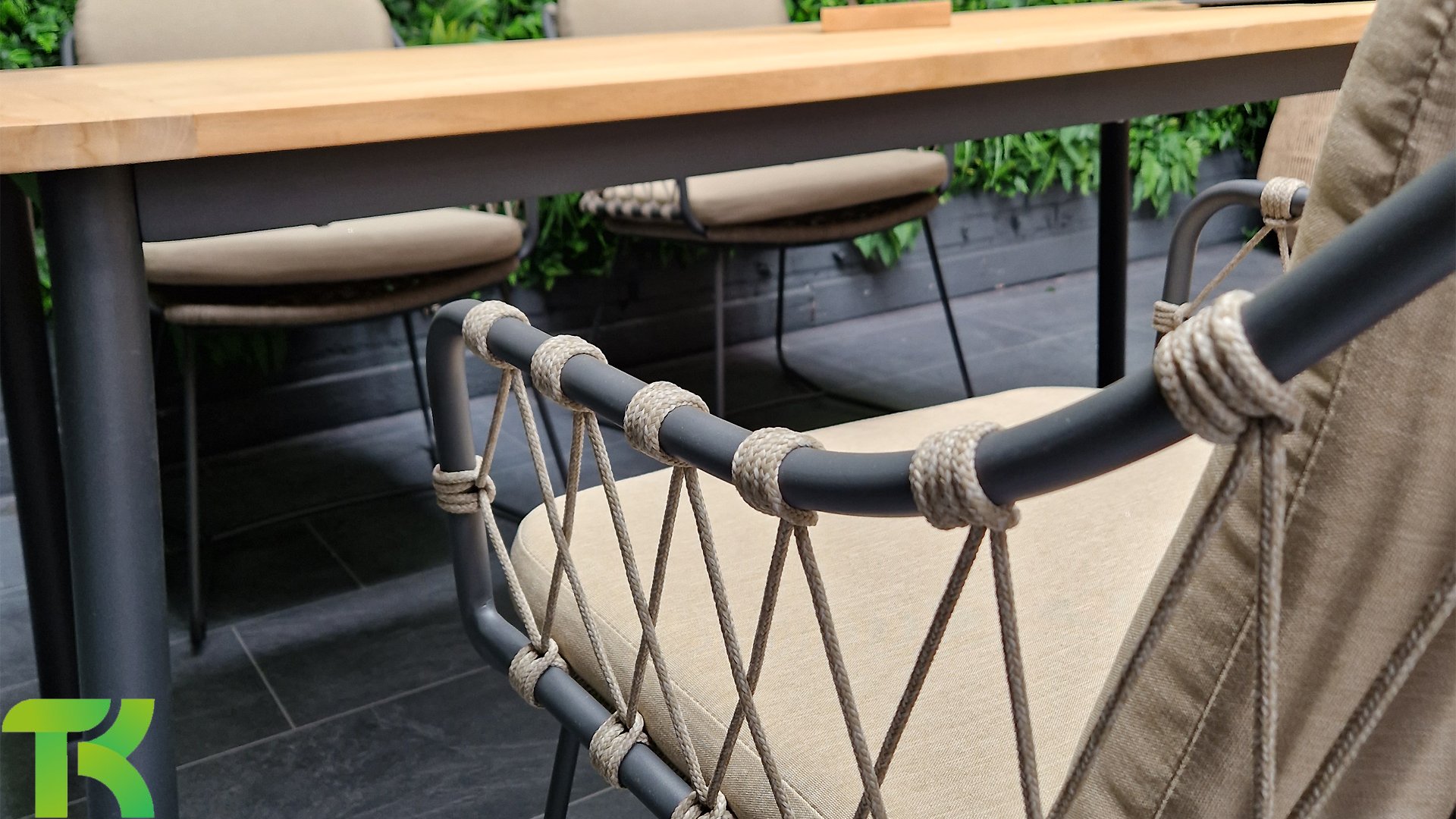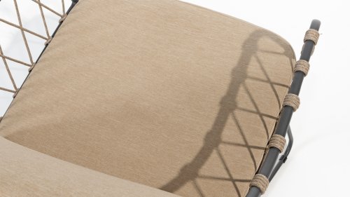 The Prego dining chair is made with high-quality taupe rope and has a sturdy frame made of anthracite stainless steel and aluminum, making it resistant to changing weather conditions. The included cushions provide extra comfort during long, relaxed dinners or cozy gatherings outdoors.
