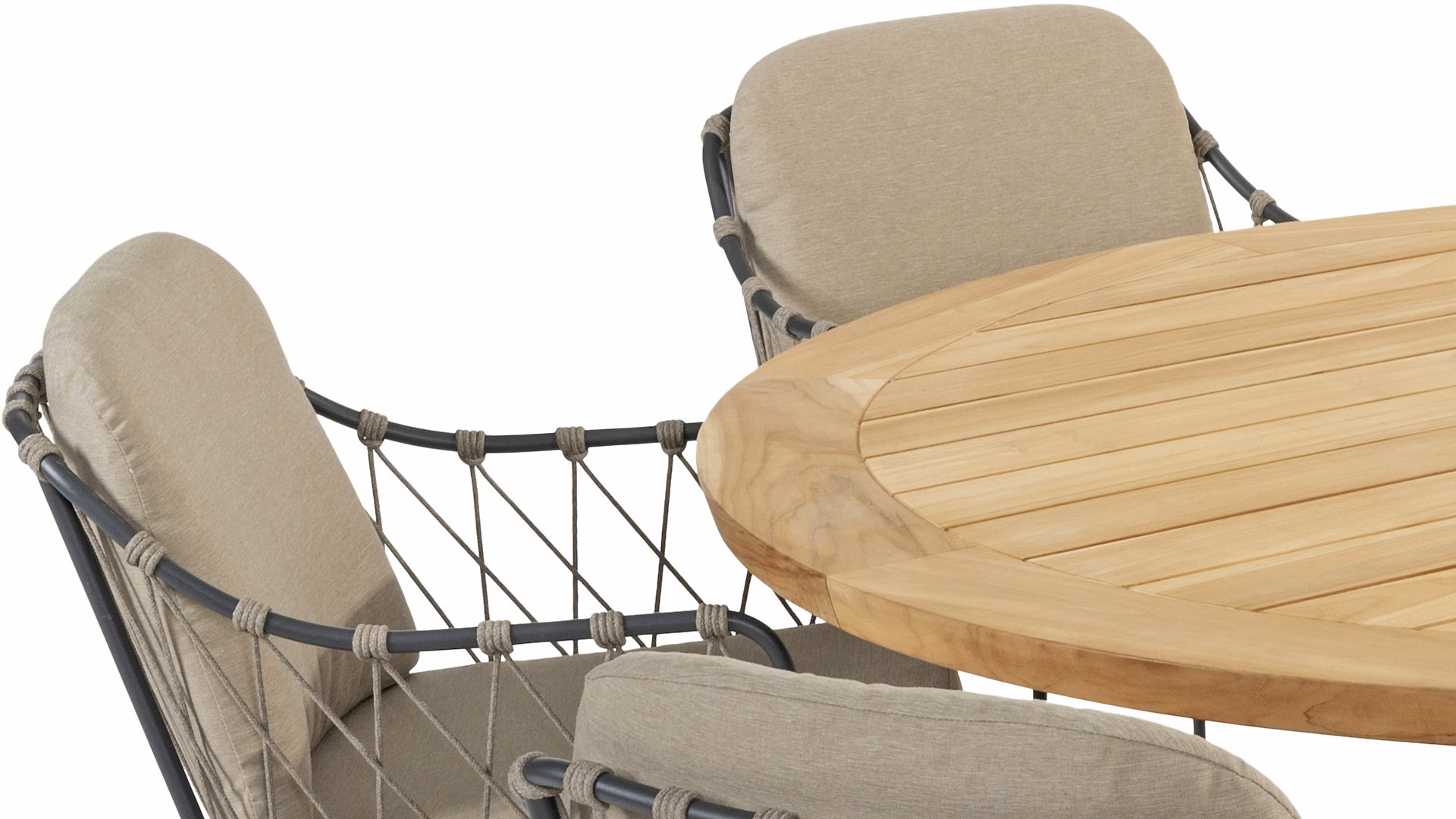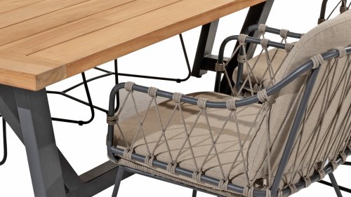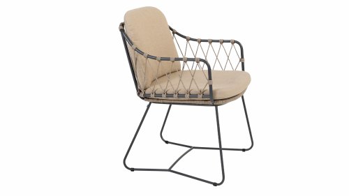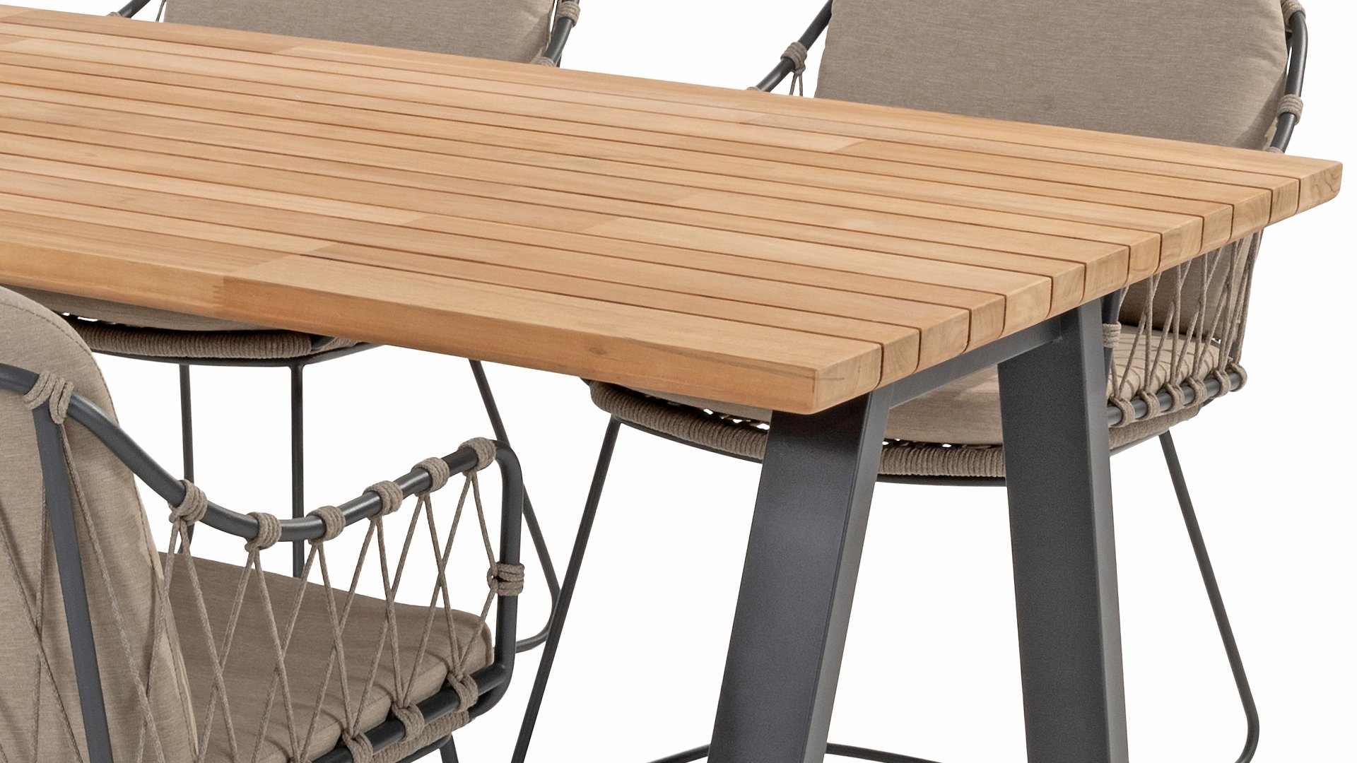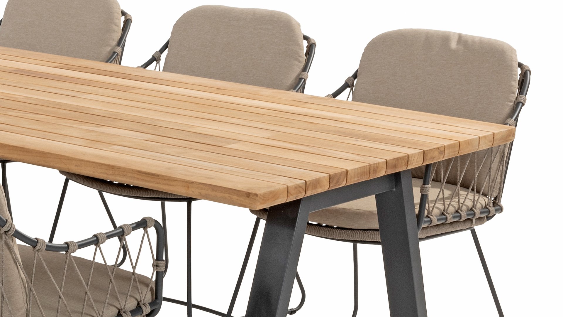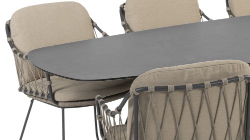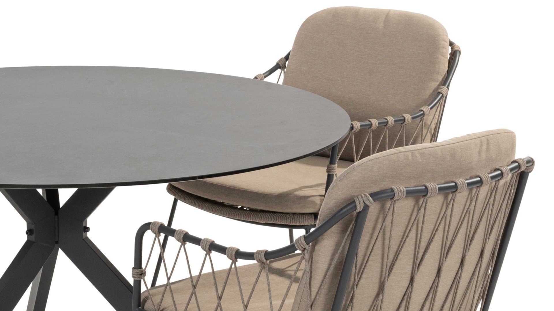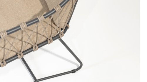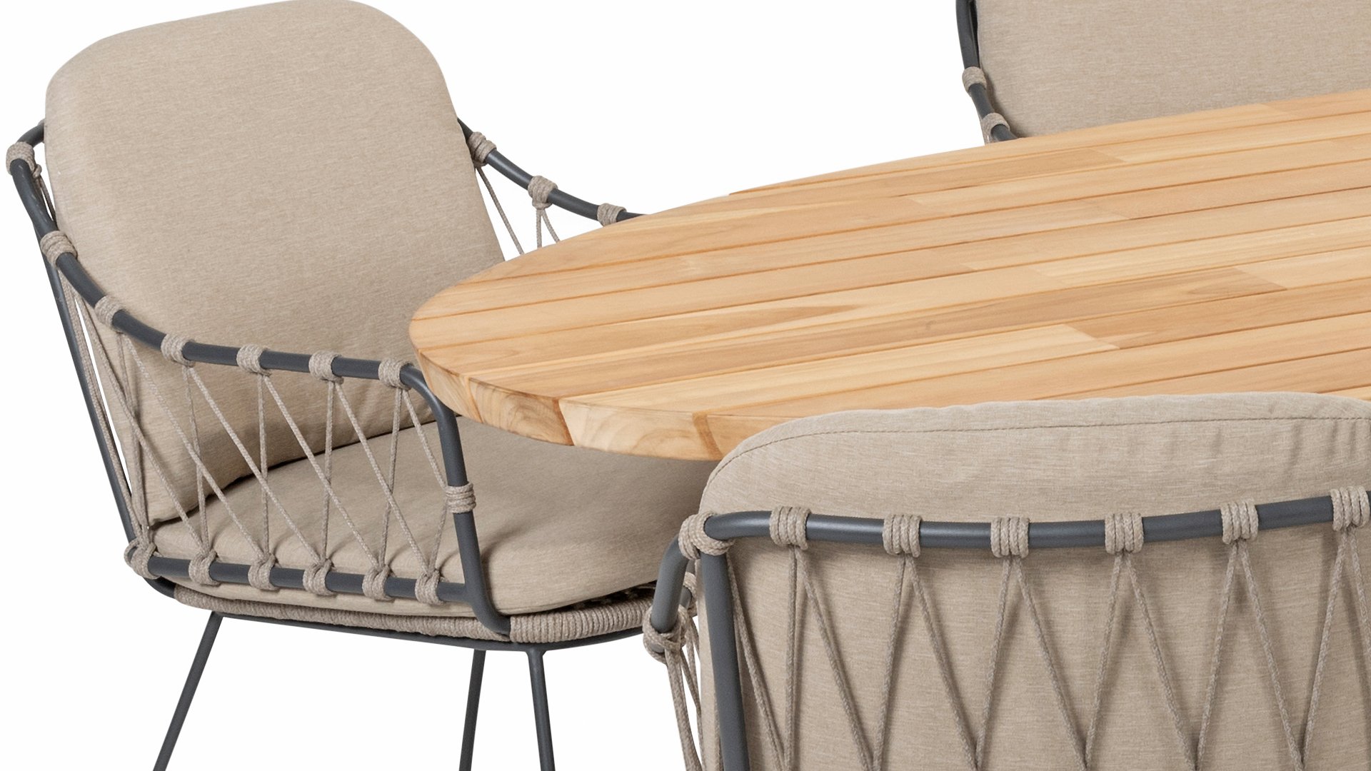 The Prego dining chair is made with high-quality taupe rope and has a sturdy frame made of anthracite stainless steel and aluminum, making it resistant to changing weather conditions. The included cushions provide extra comfort during long, relaxed dinners or cozy gatherings outdoors.