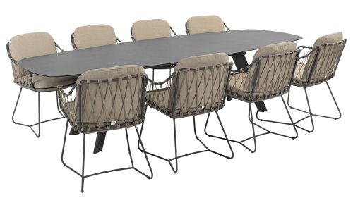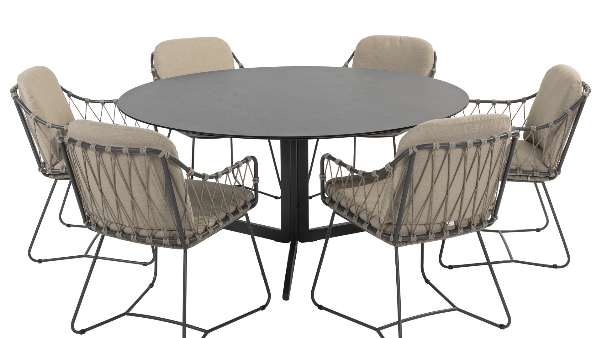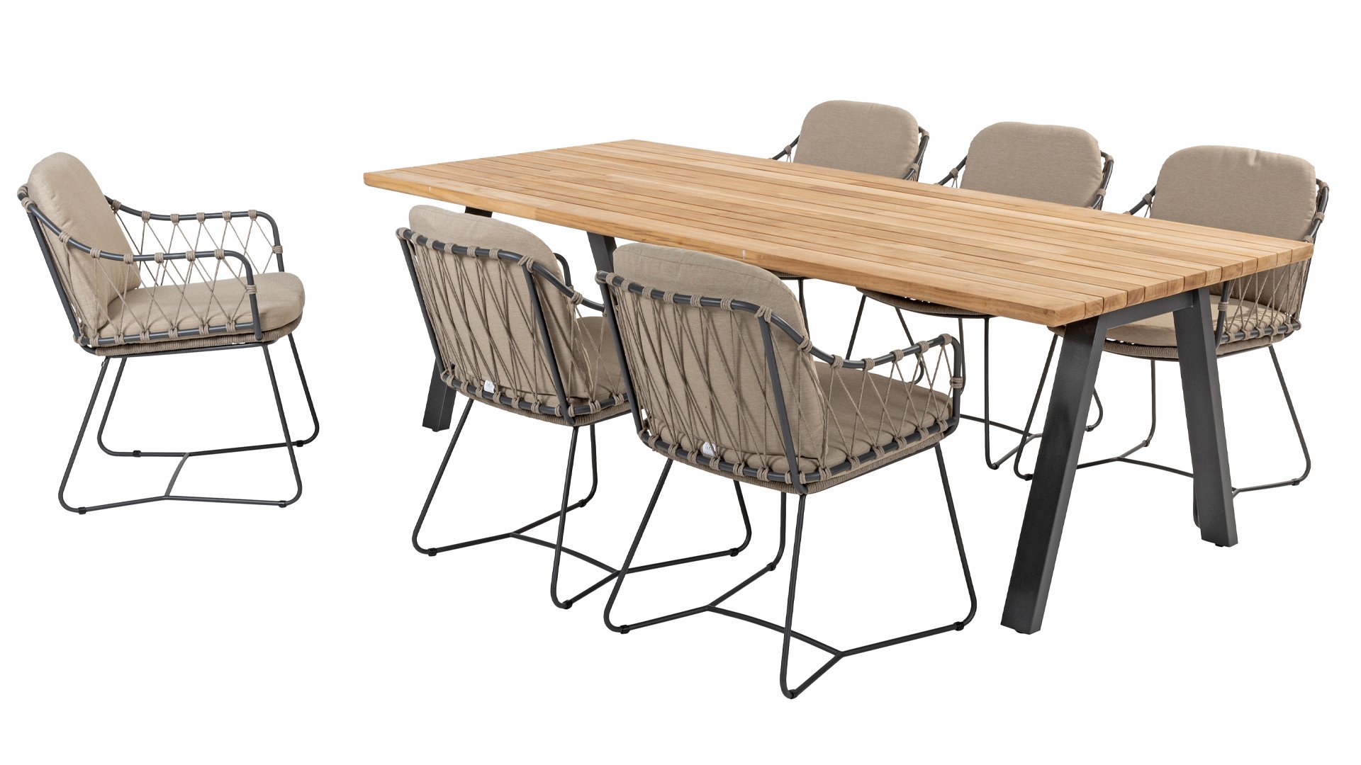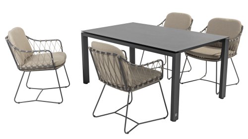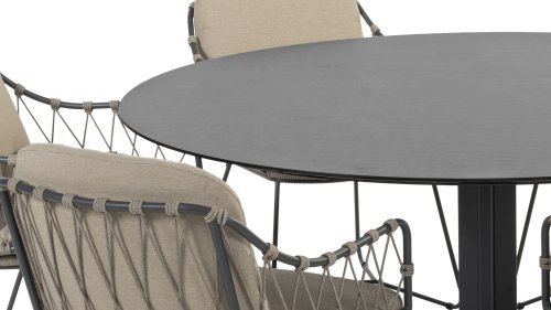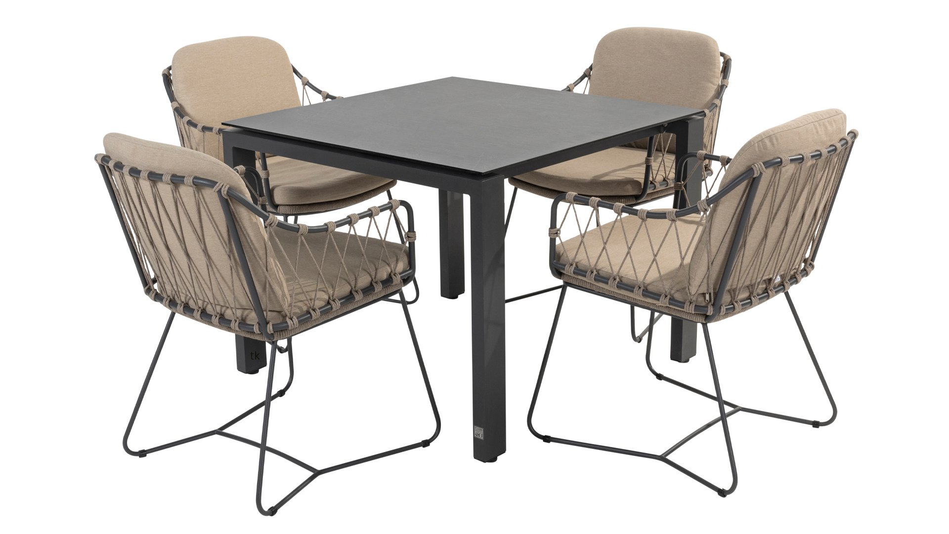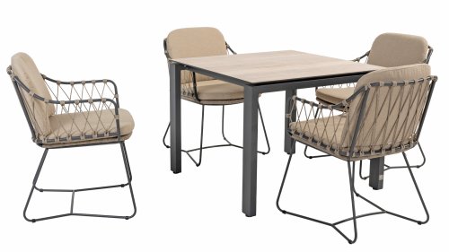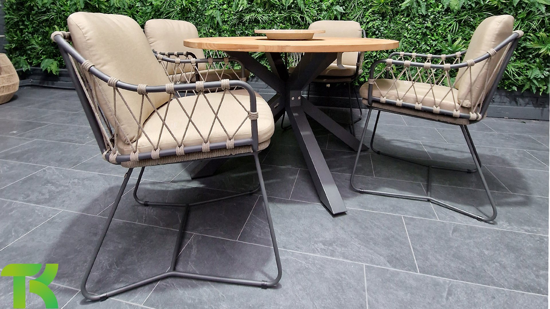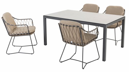 The Prego dining chair is made with high-quality taupe rope and has a sturdy frame made of anthracite stainless steel and aluminum, making it resistant to changing weather conditions. The included cushions provide extra comfort during long, relaxed dinners or cozy gatherings outdoors.