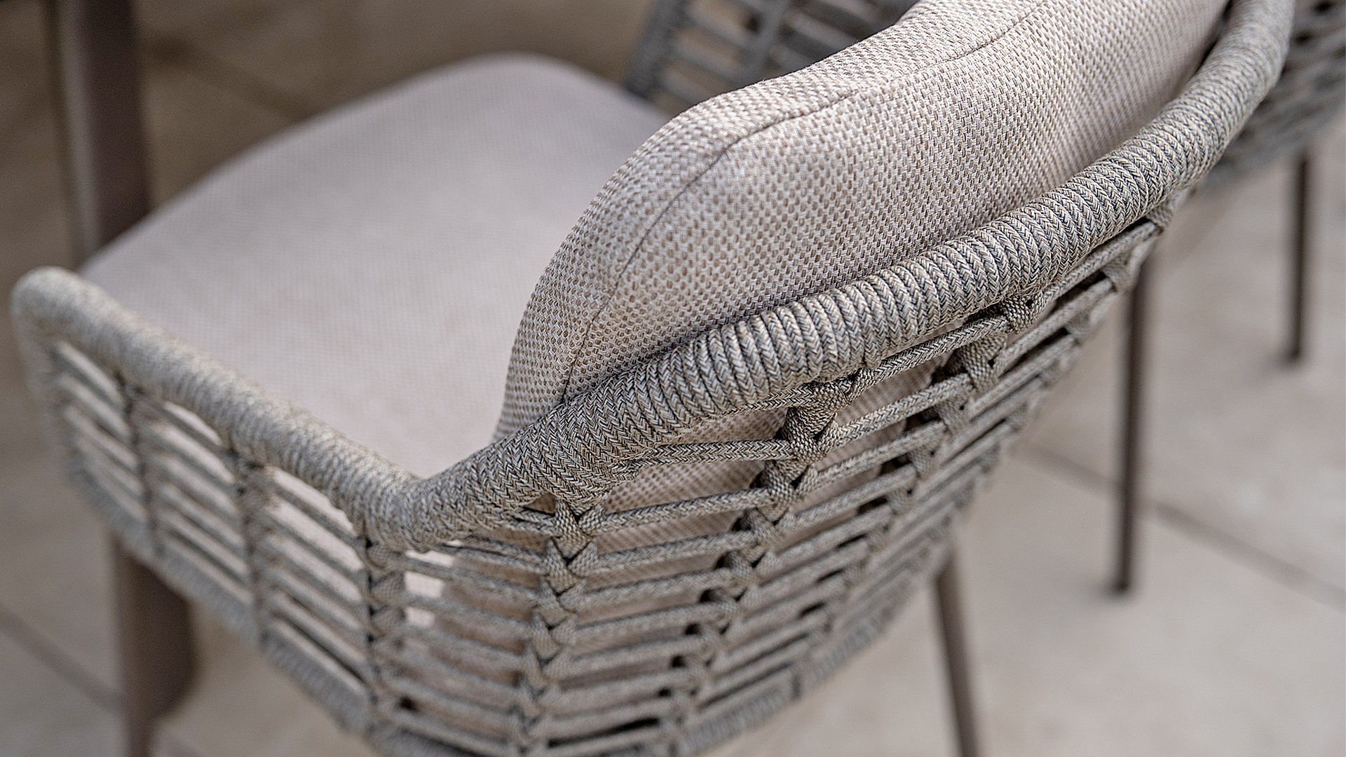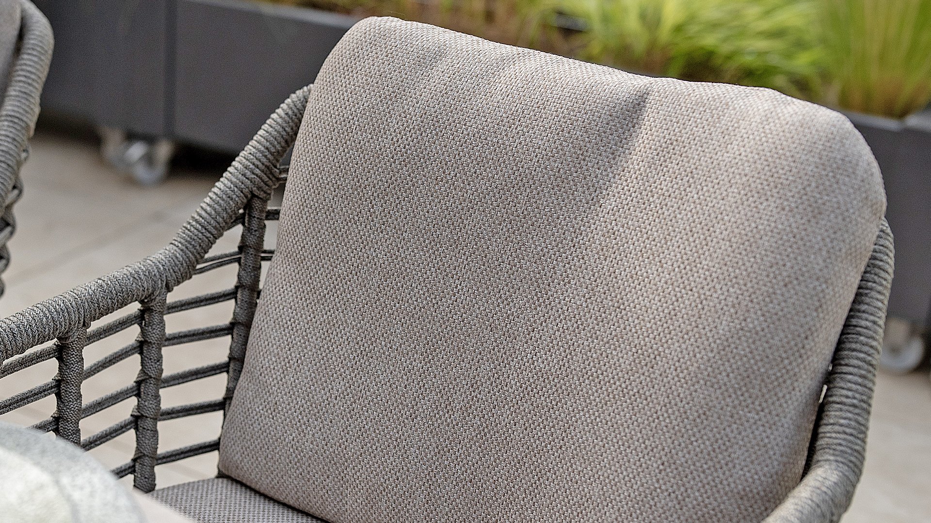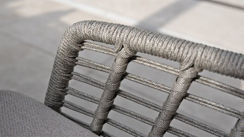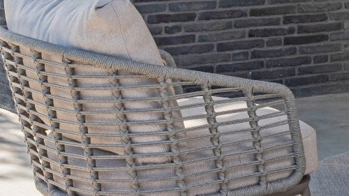 The strength of the Puglia series lies in its smart mix of materials. The frame is made of powder-coated aluminium—lightweight and rust-resistant. The back and armrests are expertly woven with high-quality rope, giving the chairs and sofas an open, airy look that fits perfectly in a modern garden. To complete the comfort, the furniture comes with cushions made from Olefin fabric. This material is not only wonderfully soft but also dirt-repellent and weather-resistant, so an unexpected summer shower is no issue at all.