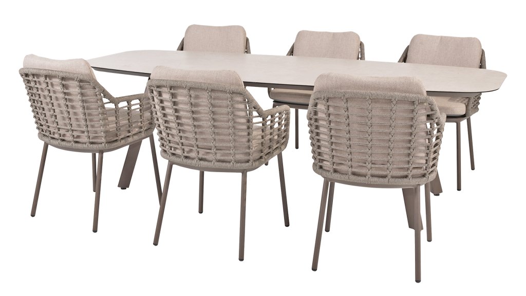 Bring the warm, authentic atmosphere of Southern Italy to your own patio. This collection is an absolute must-have for those seeking a combination of high-quality design, organic shapes, and ultimate seating comfort. The strength of the Puglia series lies in its clever blend of materials. The frame is made of powder-coated aluminum; lightweight and rustproof. The back and armrests are expertly woven with high-quality rope thread. This gives the chairs and benches an open, airy look that fits perfectly in the modern garden. To complete the comfort, the furniture is fitted with cushions made of Olefin fabric. This material is not only wonderfully soft but also dirt-repellent and weather-resistant. So, an unexpected summer shower is no problem at all.