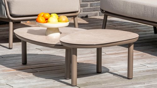 Bring a touch of elegance and refinement to your living space with the Monroe coffee table series from Taste by 4 Seasons Outdoor. This beautiful set consists of two organically shaped tables with pebble-shaped tops – playful, yet perfectly balanced. Thanks to its distinctive design, the Monroe becomes a stylish focal point of any outdoor or indoor space. The tops are crafted from printed ceramic on glass, creating a luxurious look and a durable, easy-to-maintain surface. The powder-coated aluminum base provides a sturdy foundation with a modern, airy look. The set comes in two sizes – Ø65xH32cm and Ø80xH27cm – that fit together perfectly or can be placed separately for a dynamic ensemble. Available in three stylish colors – Terre, Latte, and Anthracite – so you can effortlessly coordinate the Monroe with your interior or garden setting.