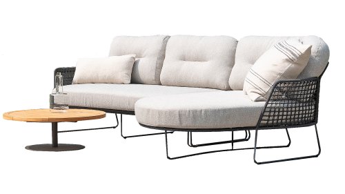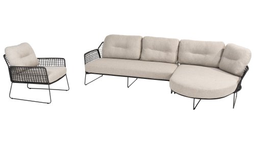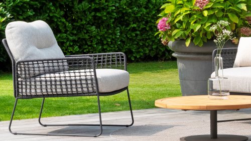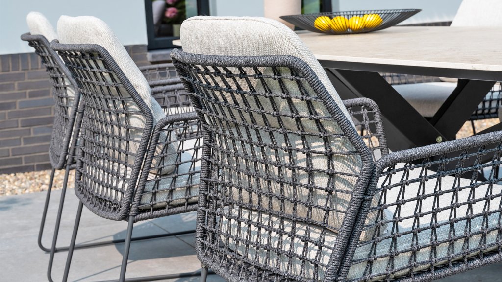 Bring the Greek sun to your garden with the Rhodos Garden Set. The modern Rhodos series features slim frames with a refined knot pattern of anthracite rope. Beautifully shaped curves in the refined design make this Rhodos dining chair or lounge set a feast for the eyes.