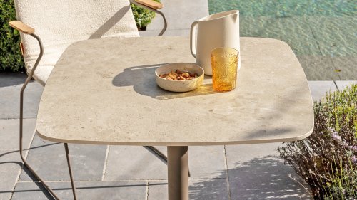 This table of 75x75 cm has an elegant ceramic top that is both stylish and practical. The ceramic is not only durable and easy to clean, but also provides a luxurious appearance. The base is in a warm, earthy tone called terre, which perfectly matches modern and rustic interiors/gardens.