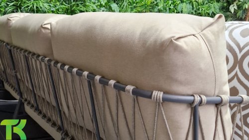 The durable fabric is rainproof, zip-out, and washable. Convenient, but be aware: the cushions are water-repellent. If you leave them out in the rain for a long time, they can still get wet inside.