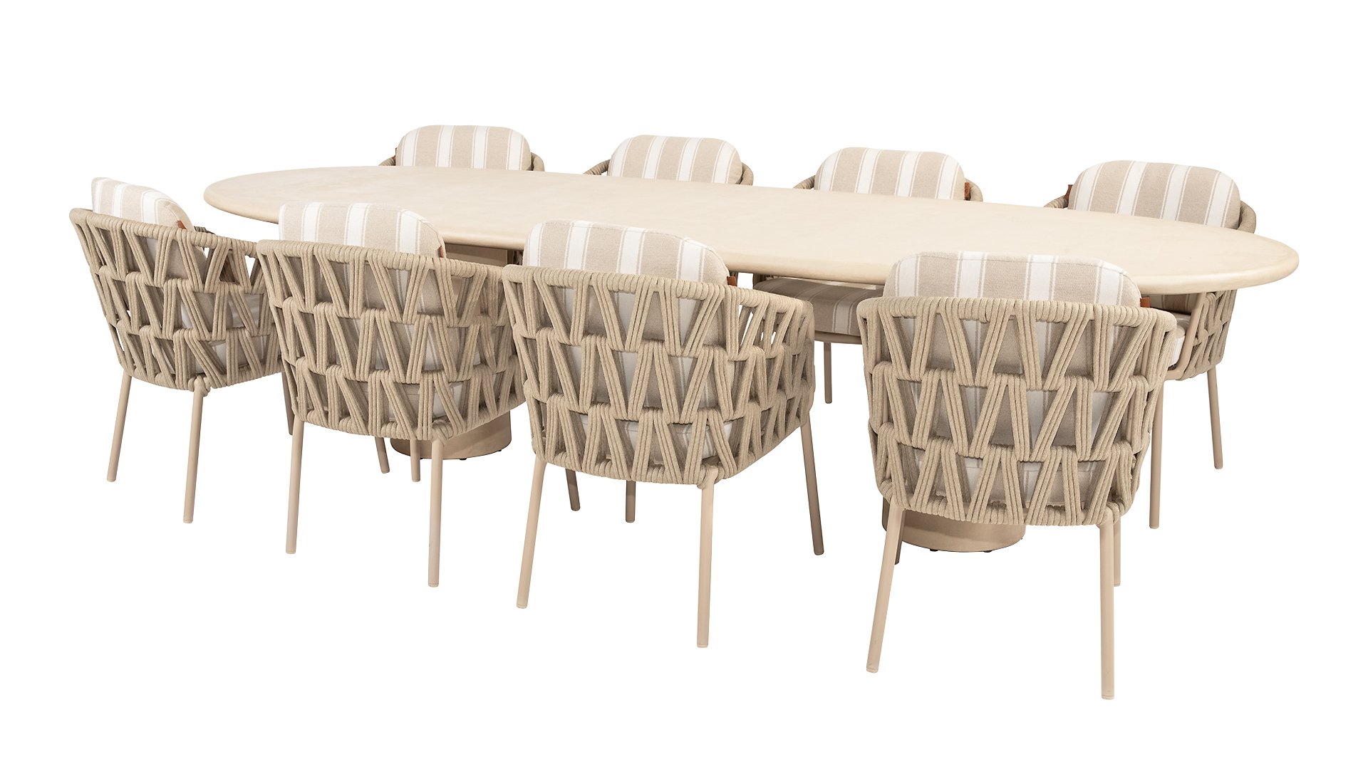 De tafel is verkrijgbaar in diverse formaten, zodat er altijd een Hampton is die bij jouw buitenleven past. Kies voor de ronde Ø160cm variant voor een gezellige setting met één elegante middenpoot, of ga voor de royale ovale uitvoering van 240cm of 300cm, beide voorzien van twee strakke, verticale poten die zorgen voor stabiliteit en een krachtig lijnenspel. Voor wie graag wat lager dineert, is er ook een low dining-versie van Ø160cm, ideaal voor ontspannen momenten in lounge-stijl.
