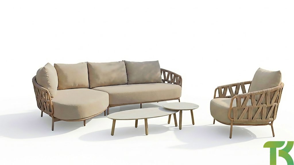 Het stevige frame is vervaardigd uit gepoedercoat aluminium in een warme aardetint, gecombineerd met opvallend dik Rope vlechtwerk. Deze ambachtelijke afwerking geeft de Biarritz serie een robuuste maar toch verfijnde uitstraling. De ruime zittingen, dikke kussens en zachte texturen maken deze lounge tot een luxueuze plek om lange zomerdagen door te brengen.