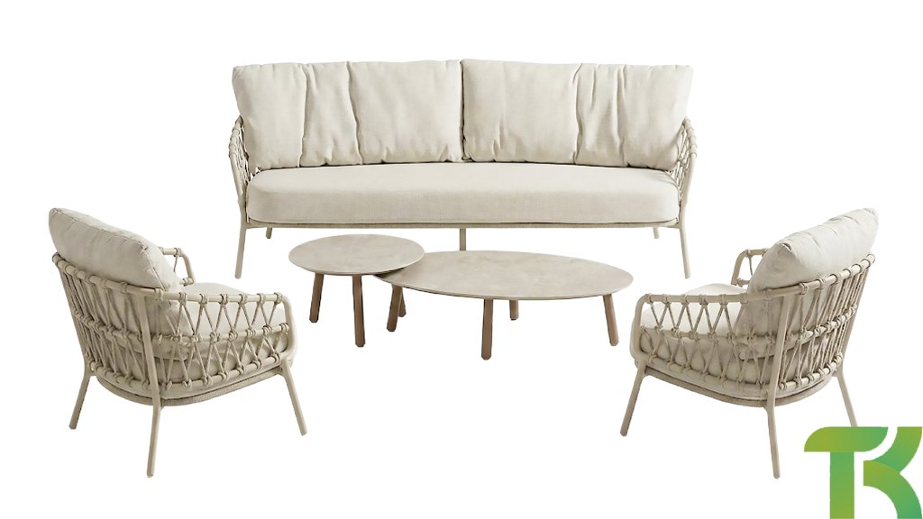 De 4 Seasons Outdoor Calpi serie in een nieuw jasje, Latte. Alleen verkrijgbaar bij 4 Seasons Outdoor Shop! Het heeft een eigentijds design en geeft ieder terras de premium en warme looks waar u naar op zoekt bent. De brede rope delen zijn op een originele manier gevlochten en geeft de Calpi een open karakter. De 4Seasons Calpi wordt geleverd met kussens in een all weather stof. Deze stof heeft een water en vuil werende werking, waardoor deze bestand zijn tegen vele weersinvloeden. Het frame is gemaakt van gepoedercoat RVS, waardoor de 4SO Calpi Loungeset zeer geschikt is om het hele jaar door buiten te laten staan.