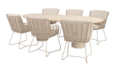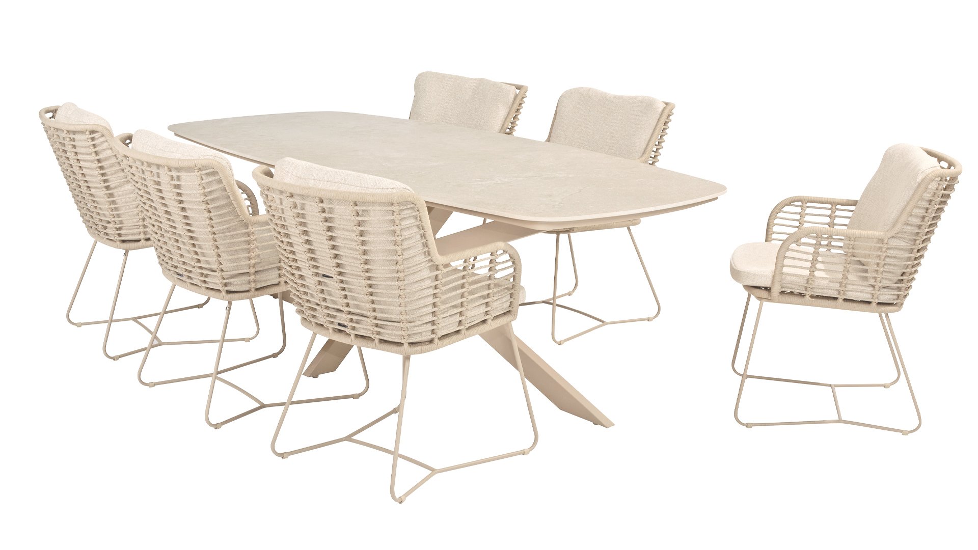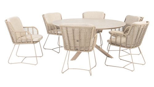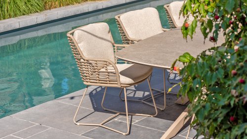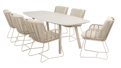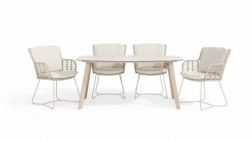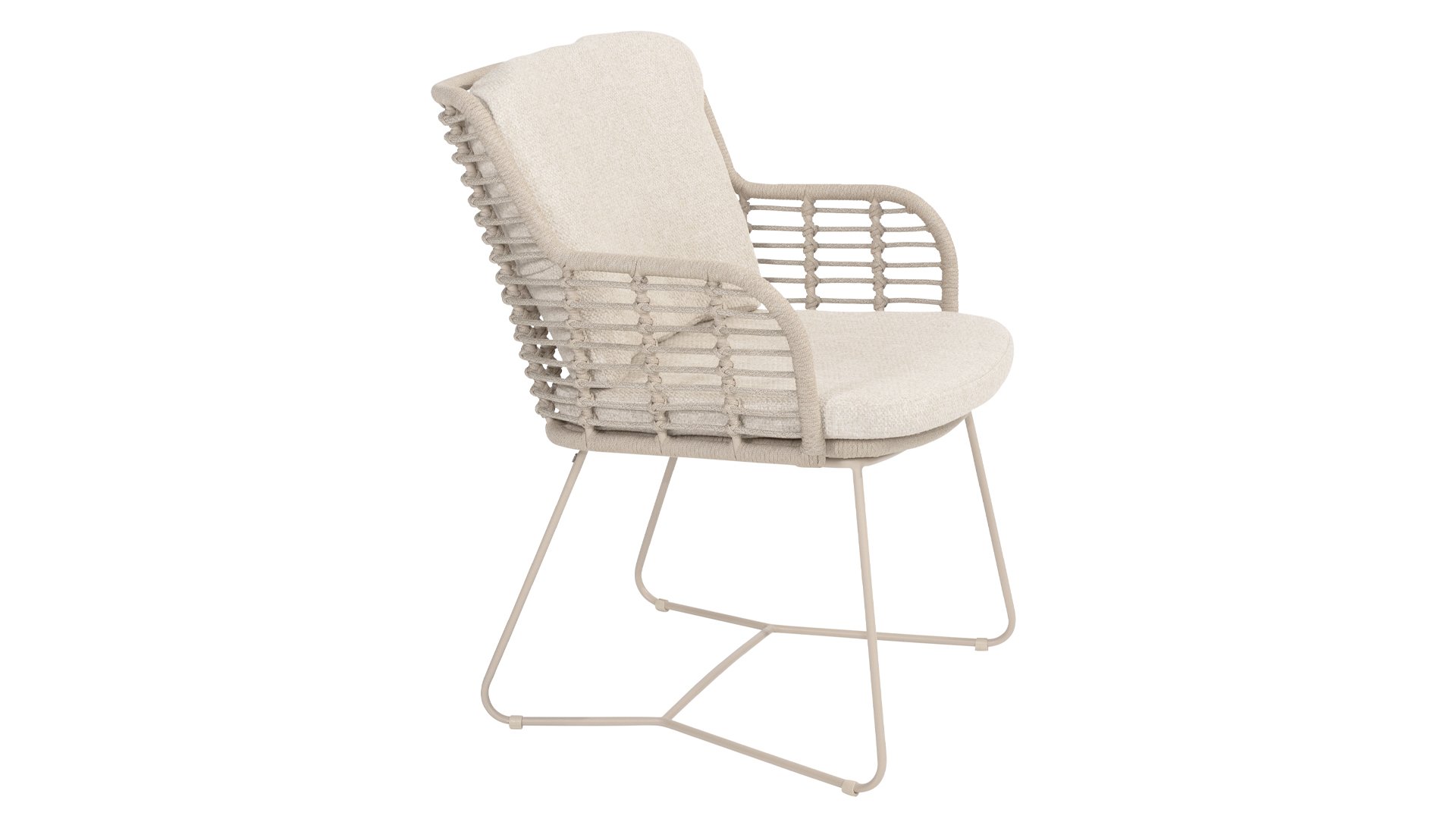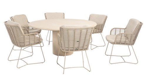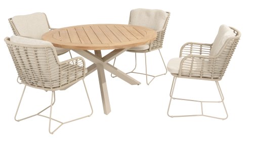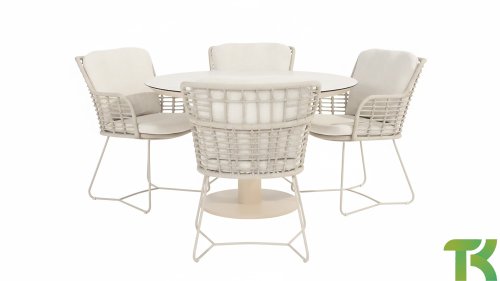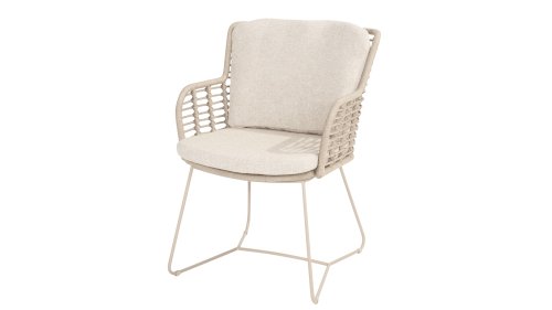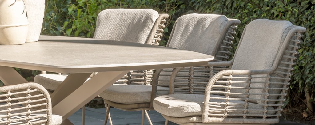 Gemaakt van de beste materialen, gemaakt met passie. Deze dining serie heeft niet alleen flair, maar ook een uitstekend zitcomfort. Het strak gewoven rope is gemaakt van kunststof rope wat een kern bevat, hierdoor is het kleurvast, schimmel- en UV-bestendig. De kussens zijn gemaakt van Olefin wat kleurvast, comfortabel en waterbestendig is. De combinatie van de kussens samen met een schuine rug zorgt voor een comforabele zit. Een design van 4 Seasons wat een lust voor het oog is. De stoel is ook verkrijgbaar in de volgende kleuren: Antracite, Latte en Terre. Het frame van de 4SO Fabrice Tuinset loopt strak en vloeiend in elkaar over en is afgewerkt met strak omvlochten Rope. Rug en zitting is gevlochten met dit sterke Rope en geeft een stevige maar comfortabele zit. Het frame vormt een speels en minimalistisch samenspel van vloeiende lijnen die samenkomen en weer uit elkaar gaan, een lust voor het oog!
