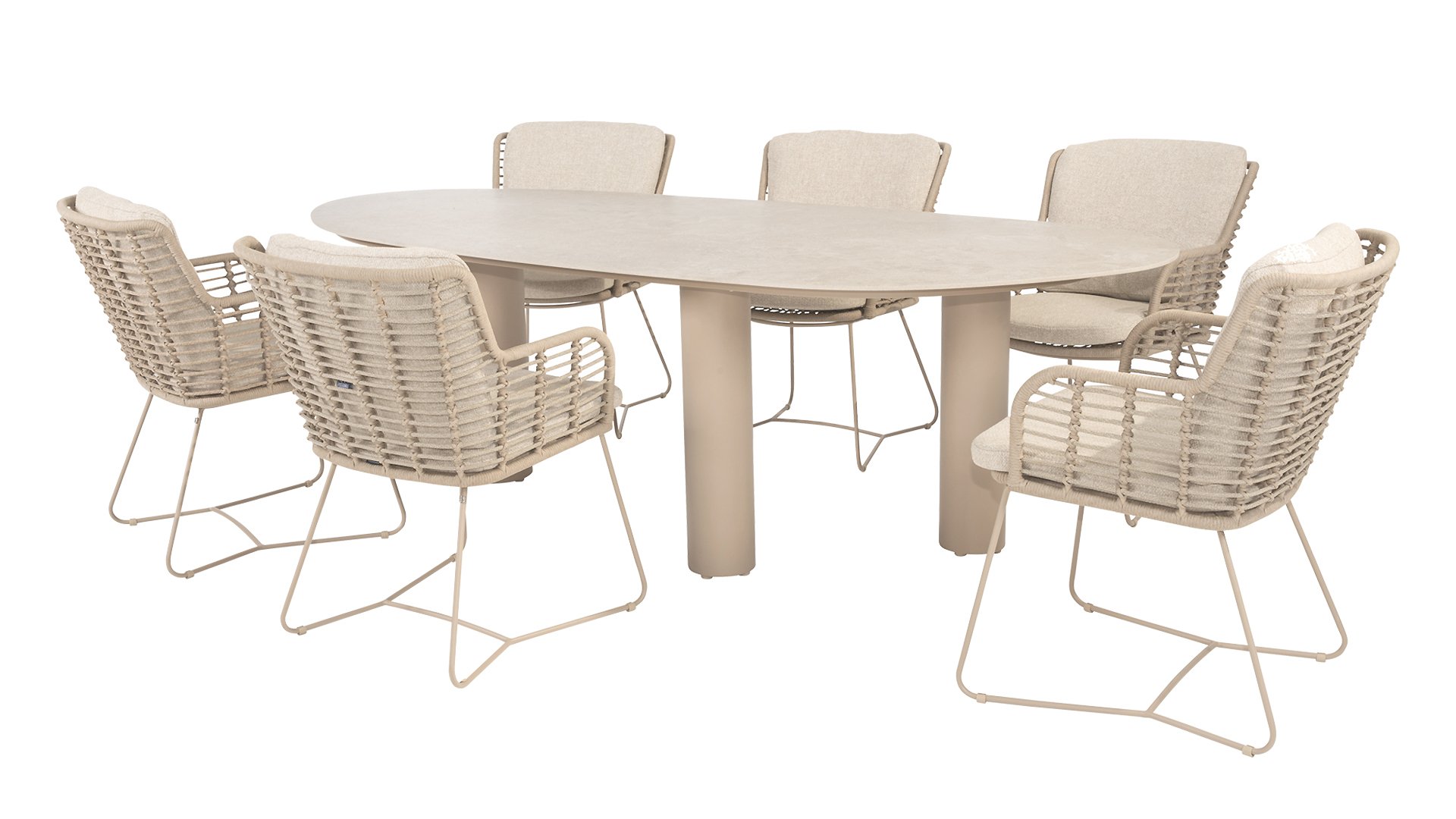 Gemaakt van de beste materialen, gemaakt met passie. Deze prachtige 4Seasons Fabrice dining serie heeft niet alleen flair, maar ook een uitstekend zitcomfort. De stoel is ook verkrijgbaar in de volgende kleuren: Antracite, Latte en Terre. De gebruikte materialen zijn kunststof rope, olefin & aluminium. Kunststof rope bevat een kern wat zorgt voor kleurvastheid en maakt het schimmelbestendig. Olefin maakt de kussens ook kleurvast en waterbestendig, de stof voelt ook comfortabel aan. Het onderstel van de Fabrice is aluminium dat is gepoedercoated om het strakke design af te maken! Ook verkrijgbaar in lounge: 4SO Fabrice Hoek-Loungeset & 4SO Fabrice Loungeset.