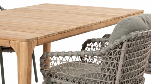 Teakhout is een natuurproduct en bijzonder geschikt voor buitengebruik. Het is bestand tegen ongedierte en schimmels en kan tegen zon, regen en sneeuw. Na verloop van tijd ontwikkelt het teakhout een zilvergrijze patina. Teakhout is een robuust materiaal en vergt weinig onderhoud. Als u de voorkeur geeft aan de originele kleur van het teakhout, kunt u eenvoudig voorkomen dat het hout vergrijst door regelmatig ons verzorgingsproduct te gebruiken. Teakhout kunt u ook reinigen met groene zeep. We geven garantie op alle productie en constructiefouten. De werking van teakhout is hier niet bij inbegrepen. Wanneer je kiest voor teakhout, verwachten we dat je deze eigenschappen waardeert. Haarscheurtjes die kunnen ontstaan, noesten in het teak en na verloop ruwe oppervlakken of onregelmatige verkleuringen zijn geen onderdeel van onze garantie. Deze eigenschappen geven het teakhout een eigen karakter en uitstraling zijn onderdeel van de natuurlijke eigenschappen. Wees voorzichtig met een bloempot of vaas op je teak tuintafel, hierdoor ontstaan er hardnekkige kringen of kleurverschillen. Imperfecties komen vaak voor, deze oneffenheden zijn kenmerkend voor dit product. Deze onregelmatigheden kunnen nooit aanleiding geven tot een claim, garantie of klacht. Dit is een teken van originaliteit!