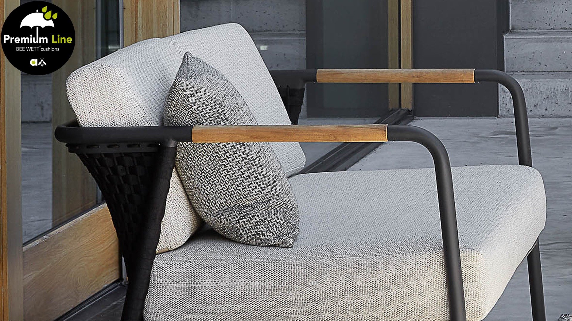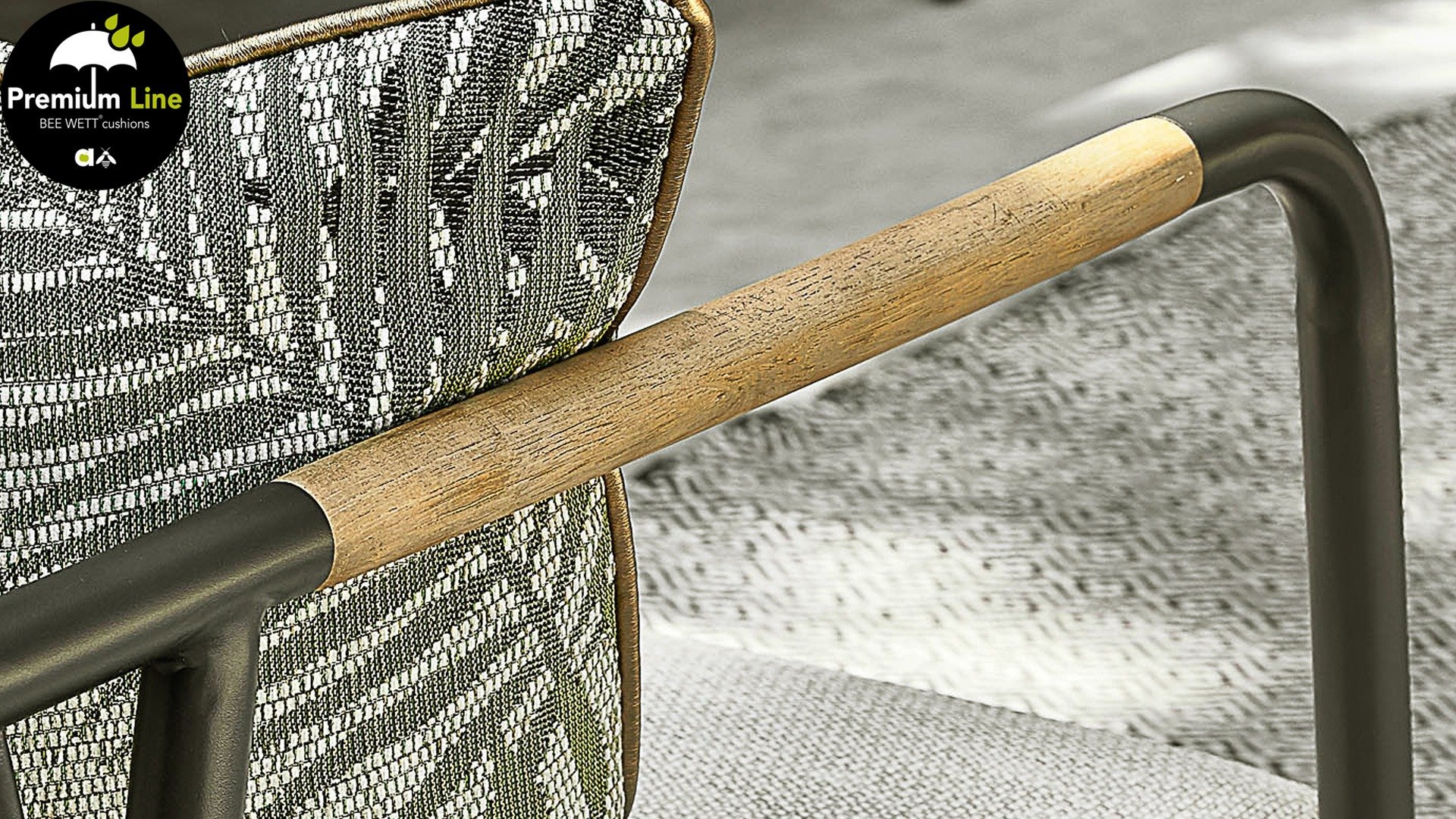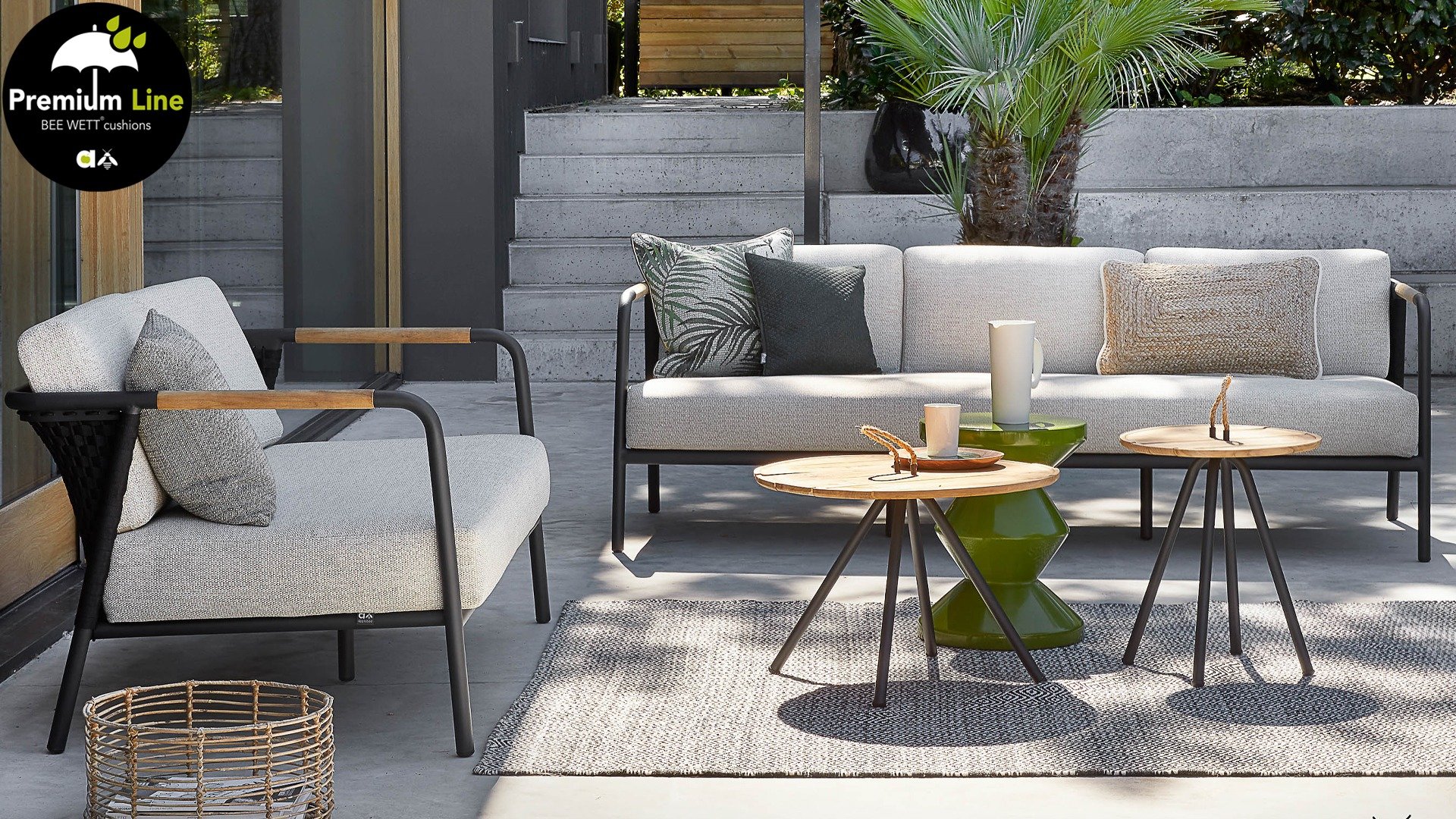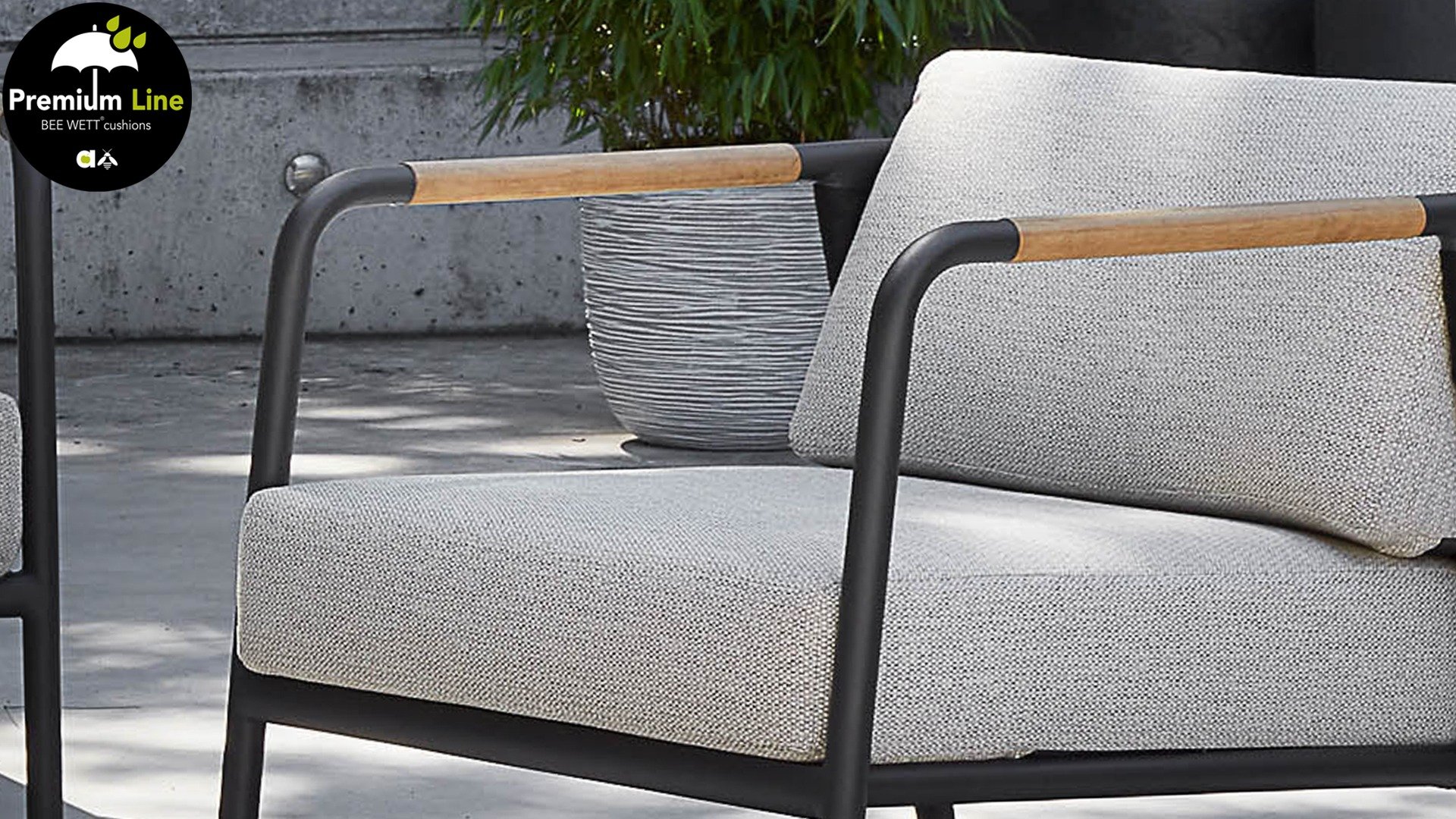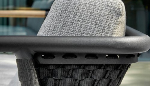 Het basismateriaal van de Elle set is matzwart gepoedercoat aluminium. De BEE WETT® kussens hebben een grove weefstructuur, maar dit wel met een soft touch voor het optimale comfort. Samen met de mooie rondingen in de rug en het gebruik van naturel teakhout in het tafelblad en de stoelleuningen, krijgt de Apple Bee Elle Lounge toch dat aangename vleugje natuurlijke warmte mee. De rugleuning is voorzien van een solide gevlochten zwartkleurige belt, die als het ware het rug kussen op de hoeken omarmt.