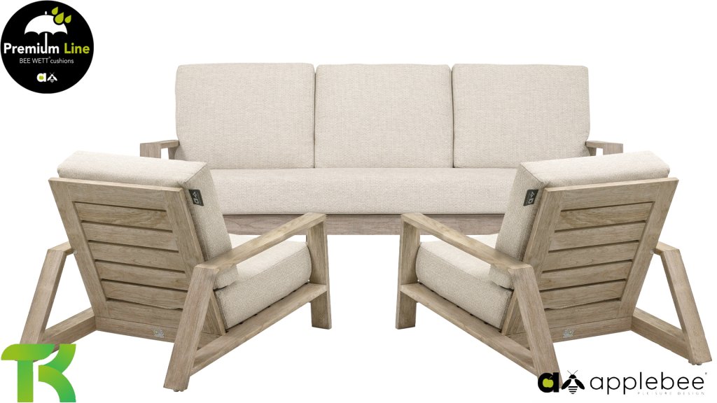De Apple Bee Spring teak collectie is minimalistisch en clean, maar springt toch in het oog door een bijzondere vormgeving. Een strak diagonaal lijnenspel, ambachtelijk verwerkt teak in een Coastal finish en zachte, comfortabele kussens in de zandkleurige stoffering. De meubelen zijn volledig uit hoogwaardig teak vervaardigd, dus ook wanneer de set zonder kussens in je tuin blijft staan, is deze nog altijd een lust voor het oog. Een ton-sur-ton topper! Met een paar mooie sierkussens naar jouw eigen smaak, creëer je in een oogwenk je eigen stijl voor jouw eigen ‘nestje in de zon’.