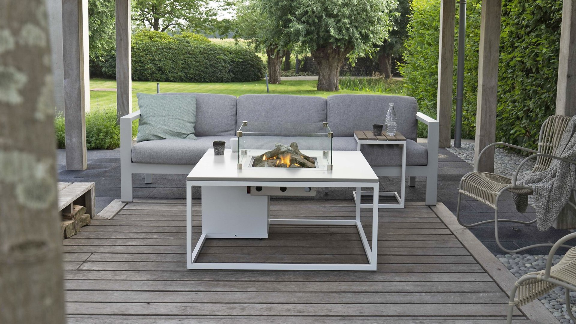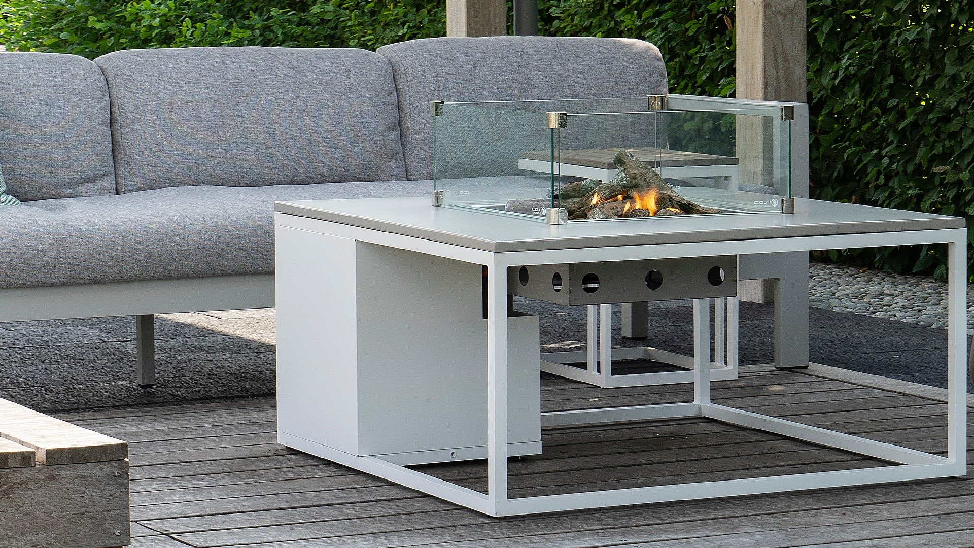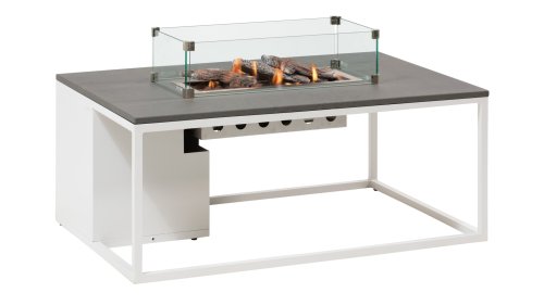 De Cosiloft 120 lounge table kan gemakkelijk worden gecombineerd met een grote range lounge sets. De Cosiloft 120 lounge table beschikt over een straight burner die genoeg ruimte geeft om al je vrienden en familie uit te nodigen voor een drankje. De Cosiloft is 80 cm breed en 120 cm lang. Deze vuurtafel heeft net als de Cosiloft 100 een mooi, opengewerkt aluminium frame dat gecombineerd kan worden met een van de drie tafelbladen: teak, zwart en grijs. Het frame is in twee kleuren beschikbaar: wit voor een moderne look of zwart voor een industriële stijl. Ondanks zijn mooie loungetafel hoogte past er in de Cosiloft 120 zelfs een 5 kg gasfles. Deze zit goed verwerkt in het pure design van de Cosiloft tafel. Bij iedere Cosiloft wordt een afdekplaat voor de brander meegeleverd. Heb je de haard niet aanstaan, kan je op deze manier toch gebruik maken van het totale tafeloppervlak.