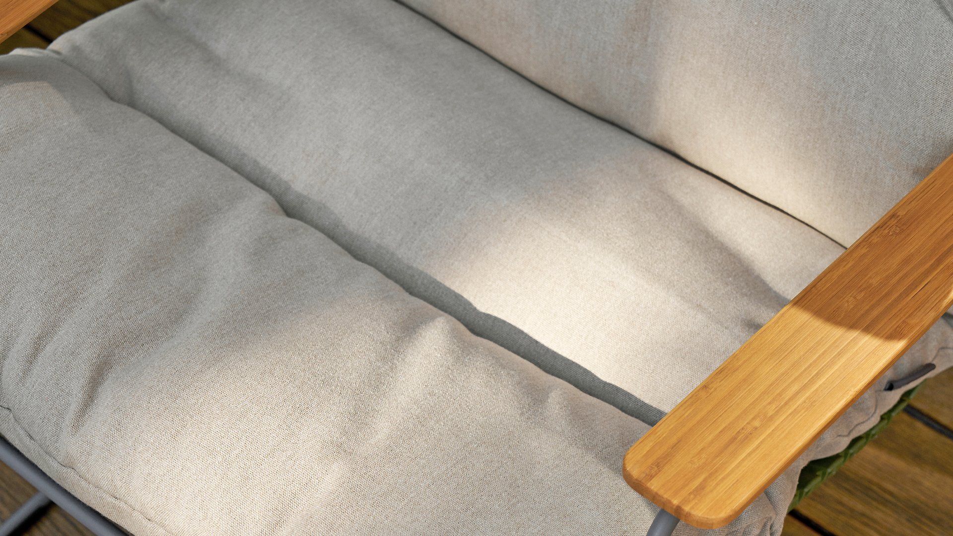 Het kussen is gemaakt van Sunbrella Heritage-stof die 50% gerecycled acryl bevat. Kleurrijke vezeleinden van het proces van hergebruik van het primaire materiaal kunnen in het weefsel verschijnen en de stofkleur doen variëren van de ene batch tot de andere. Hierdoor ontstaat een unieke stof met een natuurlijke uitstraling en vintage charme. De stof is Oeko-tex gecertificeerd, waterafstotend, vlekbestendig en onderhoudsvriendelijk.