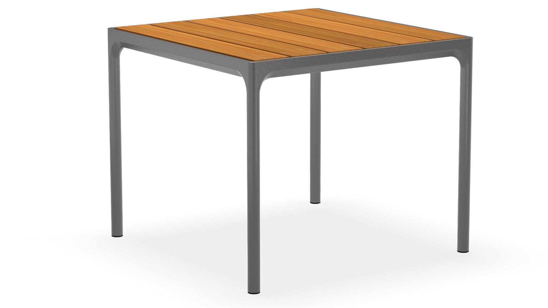 De Four tafel van Houe is een robuust model dat goed past binnen een industrieel interieur of een stoer interieur. De tafel is ontworpen om weer en wind te kunnen weerstaan. De Four tafel heeft een sterk aluminium frame verkrijgbaar in gepoedercoat grijs of zwart. Het bamboe tafelblad heeft een structuur die erg geschikt is voor het buitengebruik. De tafel komt in de afmetingen met een lengte maat van 90, 160, 210 en 270cm en hebben allemaal een breedte maat van 90cm en een hoogte van 74cm(bartafel 111cm hoog). Bamboo is een duurzamer alternatief voor teak. Wel adviseren we om de bamboe 2-3 keer per jaar in te smeren met olie, de tafel zal dan langer zijn warme kleuren behouden.