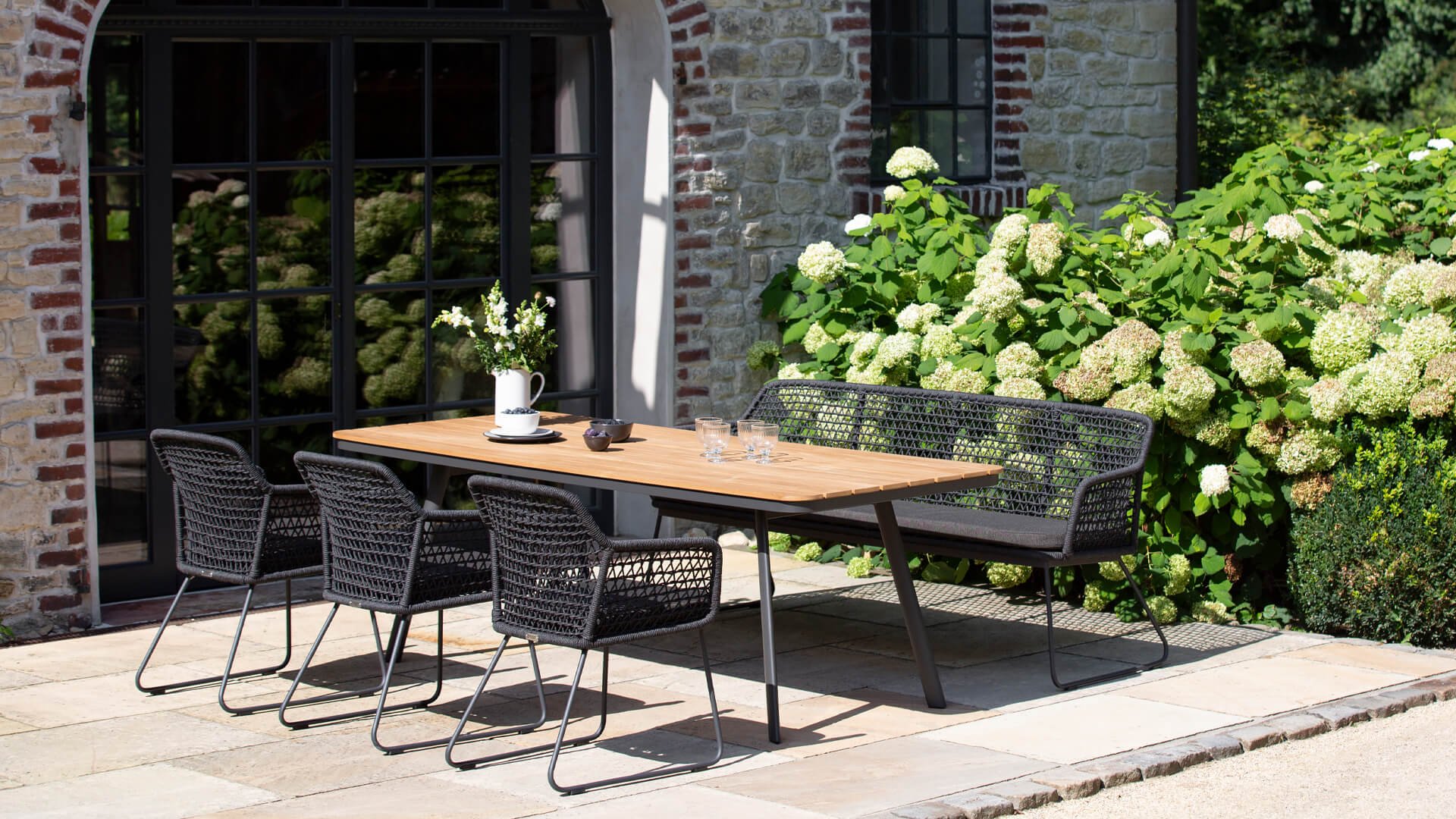 Voor het bekleden van stoelen, ligstoelen en barkrukken gebruiken we een hoogwaardig, weerbestendig snoer gemaakt van polypropyleen. Het doorgekleurde plastic koord is waterafstotend, UV-bestendig, scheurbestendig en uiterst dimensioneel stabiel. Zelfs vet dringt niet dieper in het materiaal en kan gemakkelijk worden verwijderd. Dankzij deze eigenschappen is koordvlechten ideaal voor gebruik buitenshuis. Het gevlochten materiaal geeft de meubels een organische textuur en creëert zo een verbinding tussen meubels en de natuur.