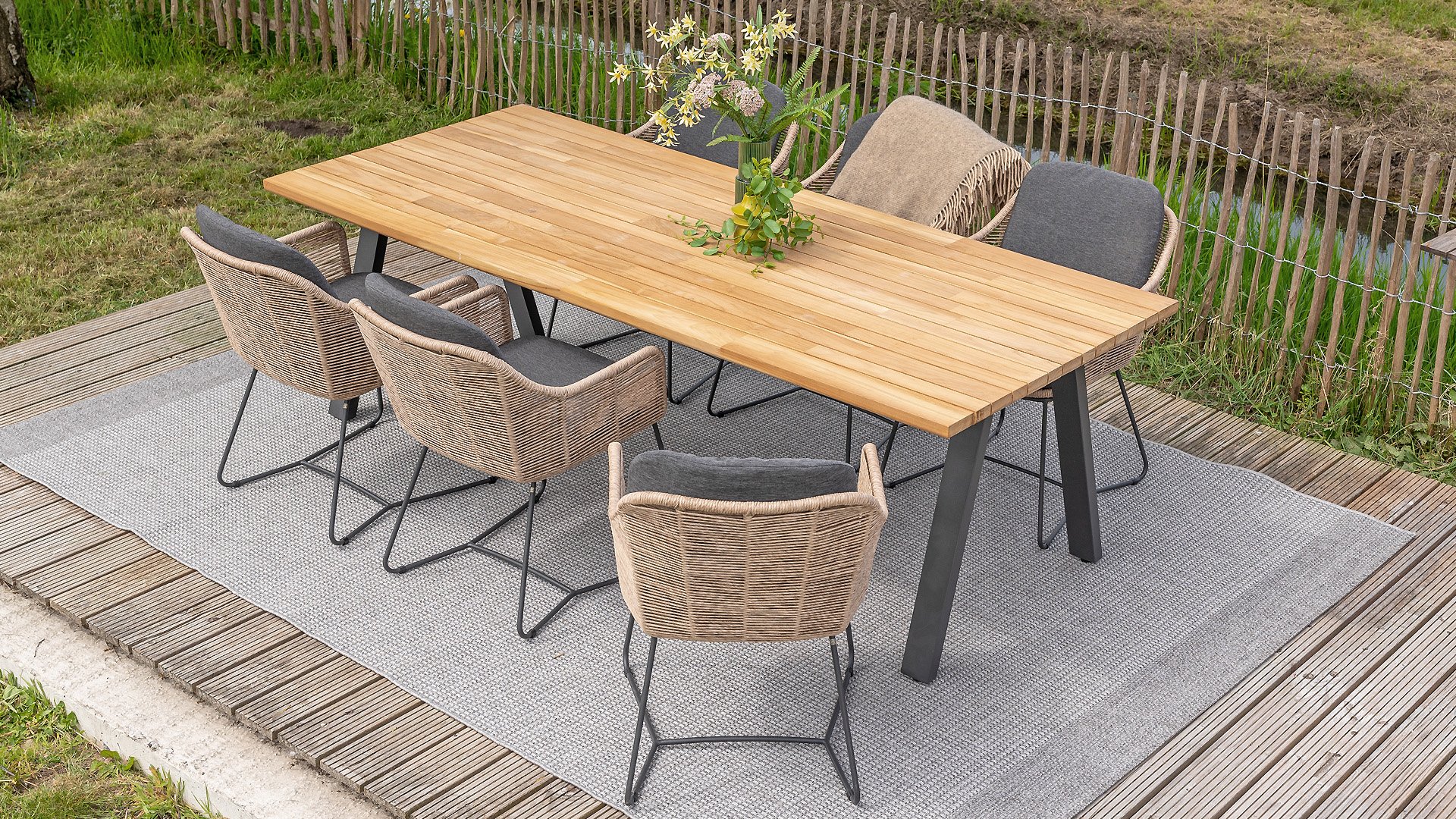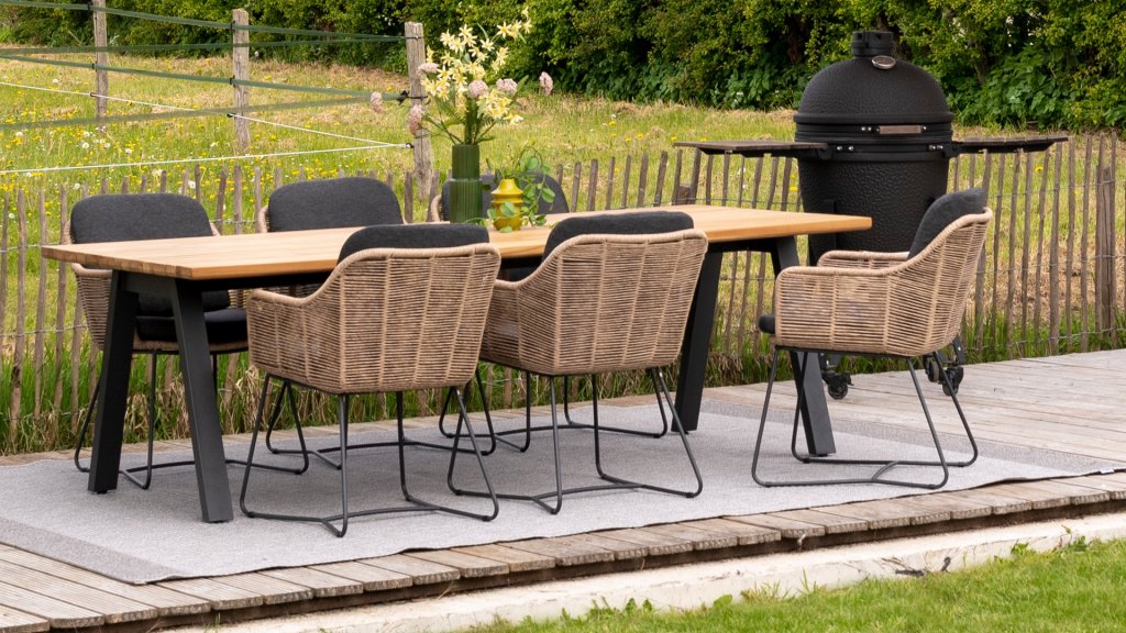 De sterke stof is bestand tegen een regenbui, uitritsbaar en wasbaar. Handig, maar let wel: de kussens zijn waterafstotend. Laat je ze lang in de regen liggen, dan kunnen ze alsnog nat worden aan de binnenkant.